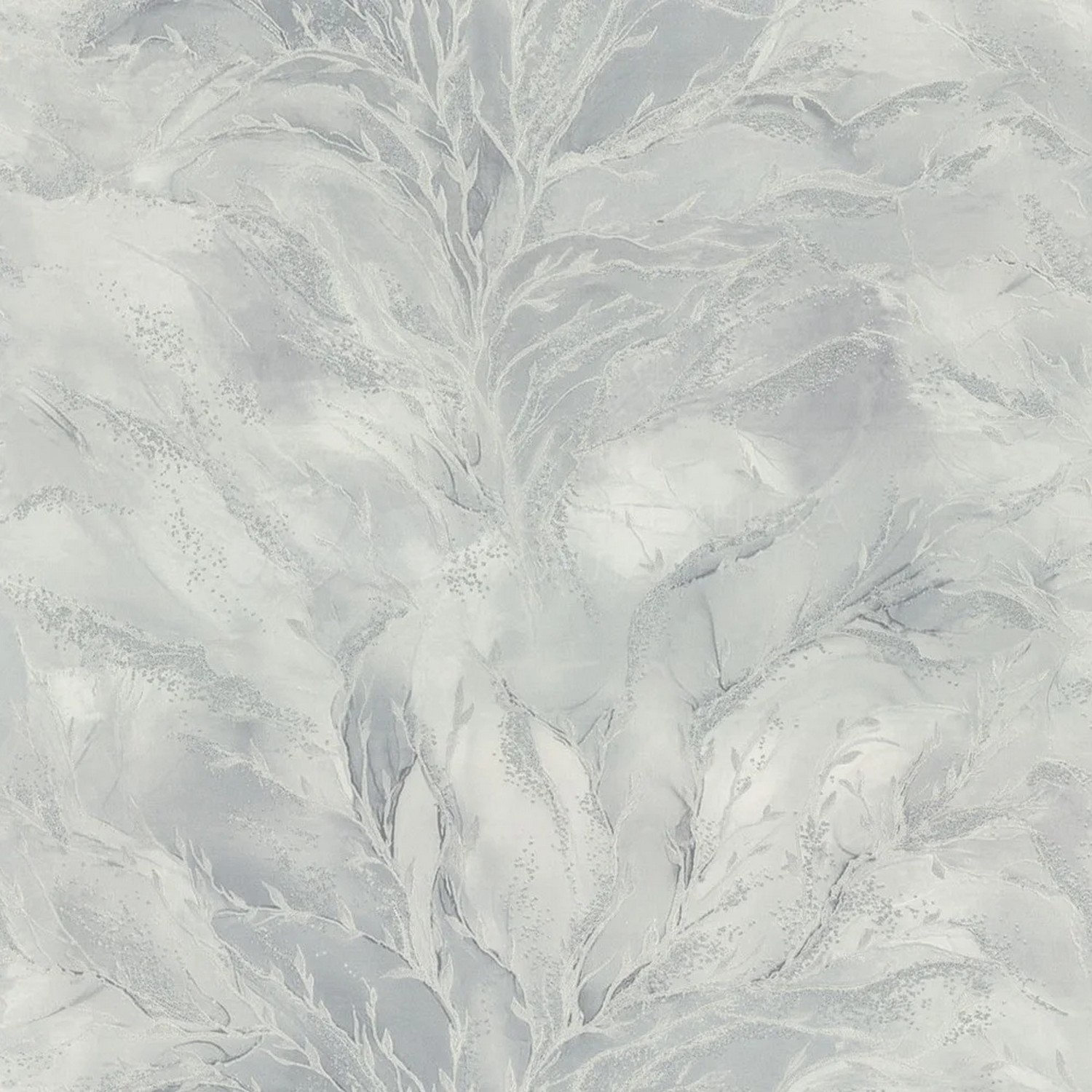 В мотиве представлены крупные листья папоротника. Хаотично раскинувшиеся на полотне, они переплетаются и накладываются друг на друга, образуя многоуровневый рисунок, благодаря чему вся композиция выглядит объемной. Разностороннее тиснение придает растениям естественную природную текстуру. Их стебли выделены контрастным оттенком, а прожилки дополнительно подчеркнуты искрящимся разноцветным глиттером. Создается ощущение, будто капли росы на листьях играют и блестят под ярким солнышком, а вкрапления металлика и переливающегося перламутра усиливают этот эффект.