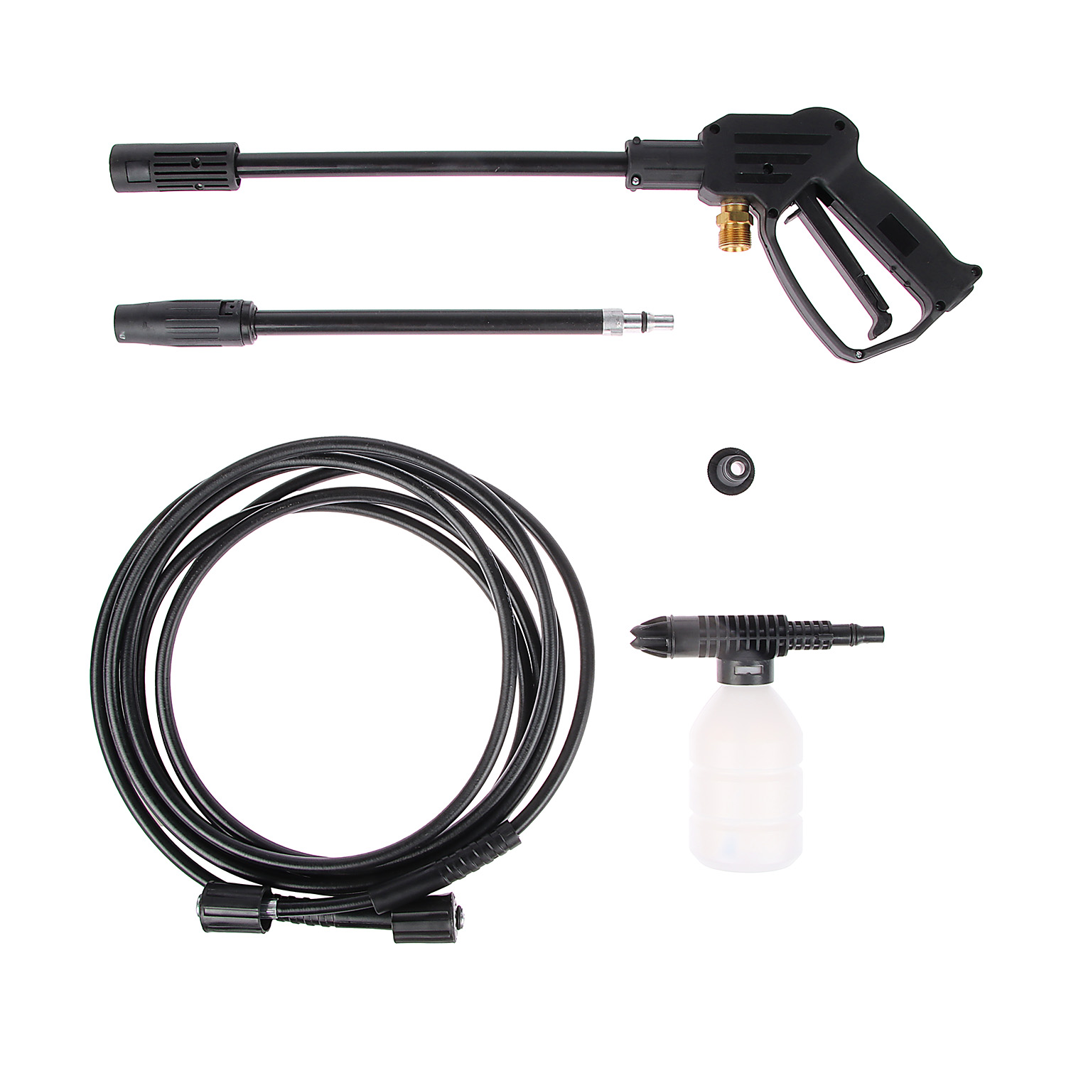 Мойка, шланг высокого давления, пистолет, направляющая трубка, трубка- распылитель, крепление трубки, подставка для трубки, штуцер для шланга, бачок для моющего средства, верхняя рукоятка, набор для чистки форсунок, набор крепежа, инструкция по эксплуатации