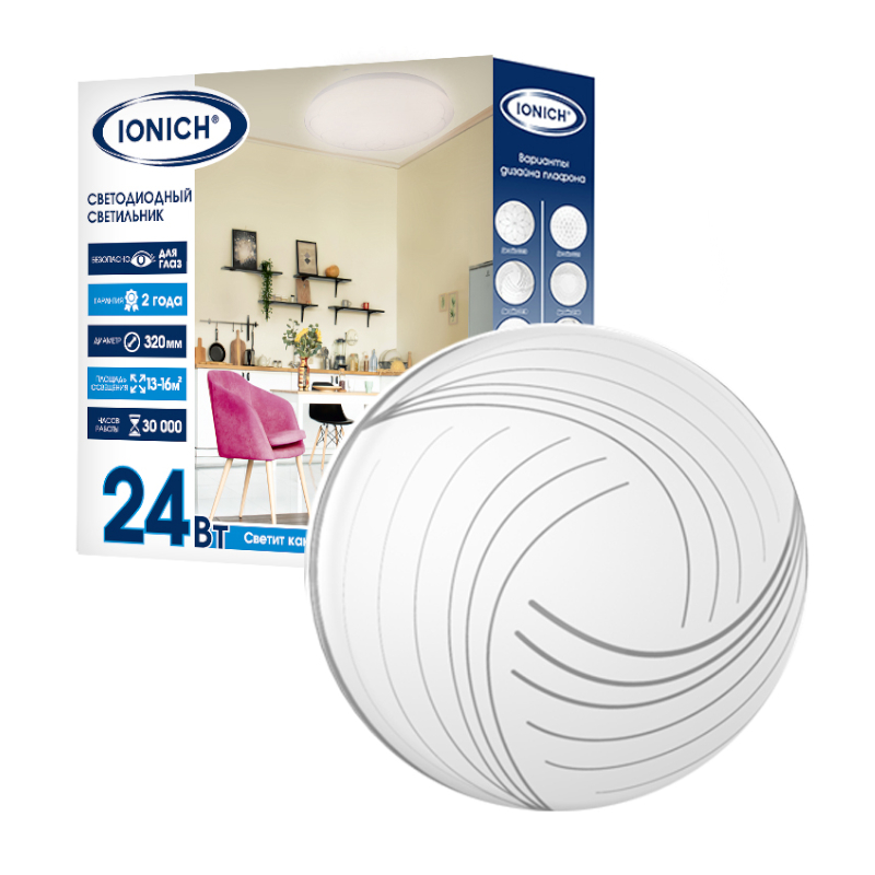 Светильник светодиодный акриловый 320мм IONICH "Венера" 24Вт 6000-6500К 1680Лм IP20 белый S=13-16м2 1689*1/20