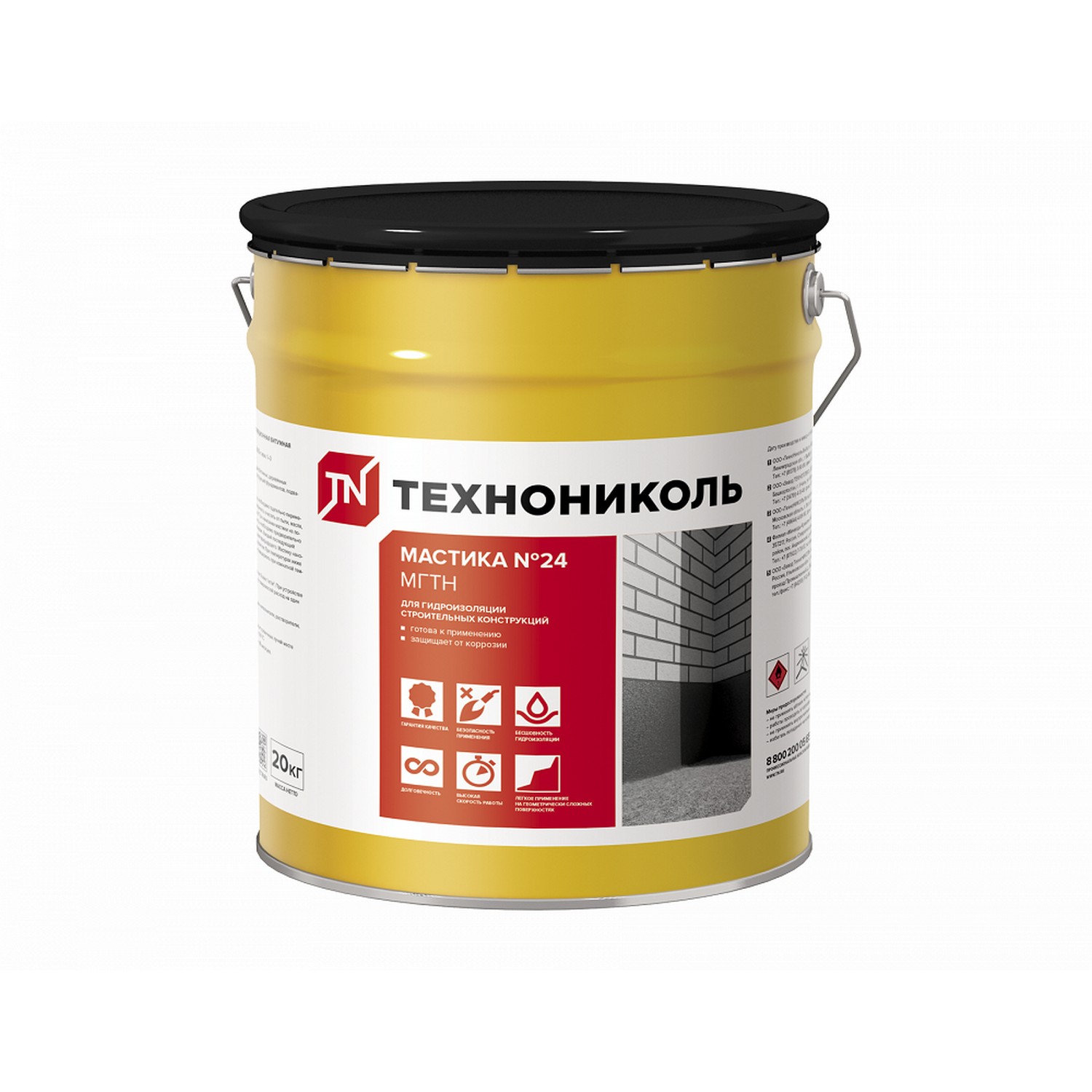 шт кгМастика гидроизоляционная ТехноНиколь № 24 (МГТН) 20 кг — полностью готовый к применению материал на основе нефтяного битума. Предназначена для защиты от влаги фундаментов, подвалов, свай и других заглубленных в почву конструкций. Создает высокопрочное водонепроницаемое покрытие без стыков, что способствует продлению срока службы конструкции. Один слой высыхает за 12-24 часа — время зависит от толщины и температуры внешней среды.