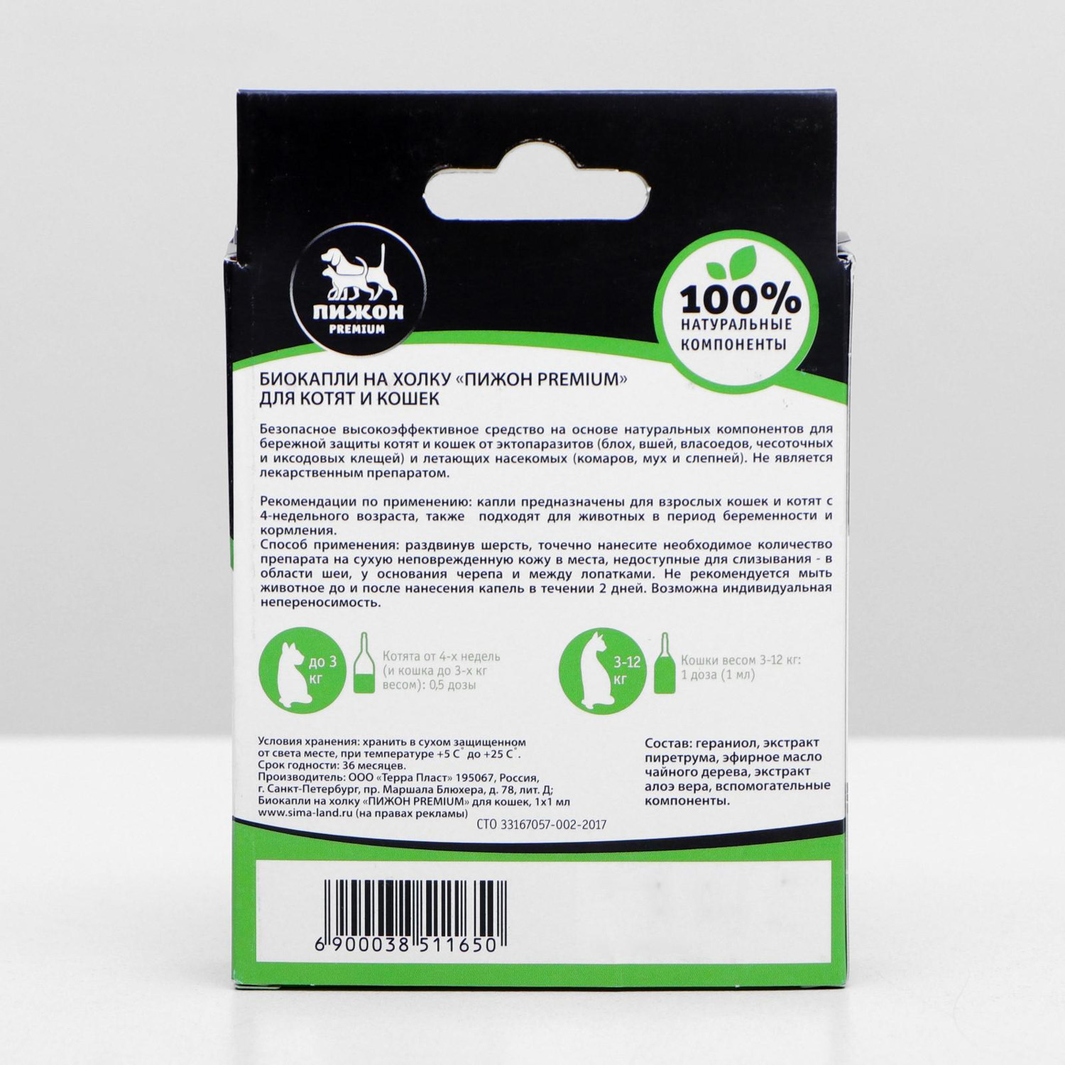 Биокапли "ПИЖОН Premium" для котят и кошек от блох и клещей, до 10 кг, 1х1мл 3851165