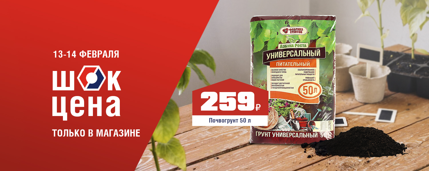 Устали от слабой рассады и поиска идеального грунта для каждой культуры? Универсальный почвогрунт — это ваше готовое решение! Сбалансированный состав и оптимальная кислотность создают идеальную основу для томатов, огурцов, перцев и цветов. Он обеспечивает здоровый старт растениям, избавляя вас от лишних хлопот и гарантируя отличный результат. 13 и 14 февраля в розничных магазинах ДомоСтрой не пропустите ШОК-цену: